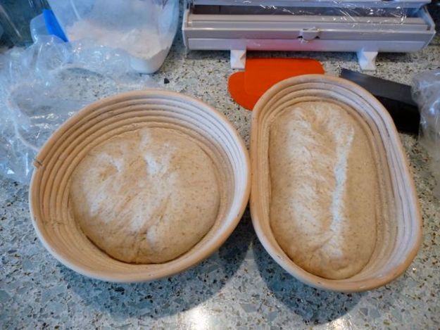 I made a round boule and an oval loaf, and used a couple of forms dusted with rye flour to hold them while they proved. They were hopping out of these after an hour and 15 minutes. I hoped that they would both fit on the stone, but I realised when I ‘outed’ the first one that I was going to have to do a bit of juggling as they wouldn’t fit. So I started one on the stone, moved it up to the little top oven after 20 minutes, and then put the next one in down below. It all worked out ok in the end.