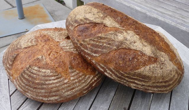 English people tend to prefer paler crusts, but I am a big fan of the taste of these dark crusts and the contrast with the airy, creamy crumb flecked with the bran from the stoneground wholemeal flour. Good crust and a light crumb that didn’t squash together when you sliced it. Great aroma too – I wish WordPress did ‘scratch and sniff’ but maybe one day….