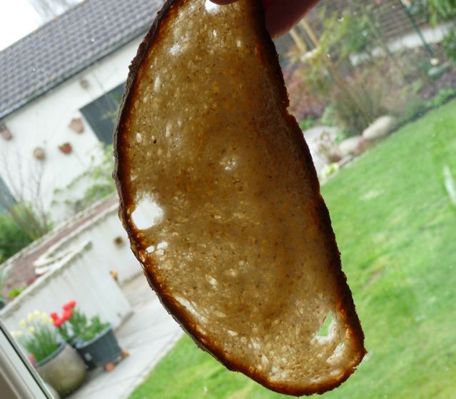 I did my own windowpane test to see what the slice looked like. You can see the way that the two doughs didn’t mix perfectly, and that there was the odd huge bubble that got through to the final bread.