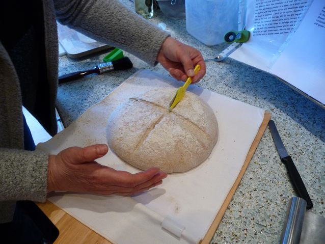 Gave the bread the prescribed 2 folds at 50 and 100 minutes; used a little olive oil on the board and my hands to help me deal with this loose and sticky dough. Then after another 50 minutes, pre-shaped it once with flour, left it for a little, then shaped it again and placed seam side up in a lined banneton dusted with rye flour; popped its shower cap on, and onto in a sunny window where it sat for 2 hours, average dough temperature during this period about 76 ° F as per book. It didn’t do much for the first hour…