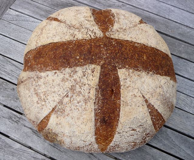 It has a low profile, fine – I was expecting that! It has a strong clear sour taste from the long fermenting period and a nice chewy texture. If you don’t like wholemeal bread, then this won’t make you happy, but if you like the idea of wholemeal but find it a bit bland sometimes, this might just be the bread for you, but it won’t be to everyone’s taste. I have no idea what it should be like, but hope that it hasn’t been too ‘lost in translation.’