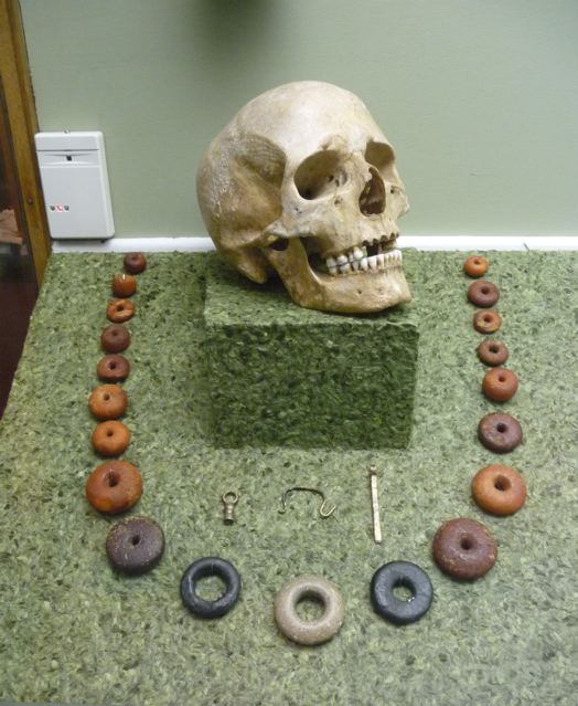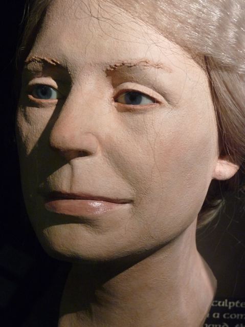 I went into Gloucester City Museum the other day in search of a loo (like you do) and stopped to have a quick peek at the exhibits. I liked this skull framed with an extraordinary collection of amber and Dorset shale beads. The central bead is of pyrophillite which came from the Baltic as did the amber. The head below is a reconstruction of the skull.