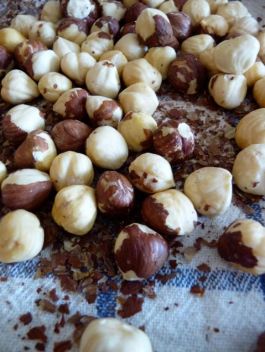 they had skins on and I got most of them off by putting them in a teatowel and rubbing them. Some were stubborn but most of them came off this way. Then I chopped the hazelnuts coarsely with the whizzer and that was the main preparation done.