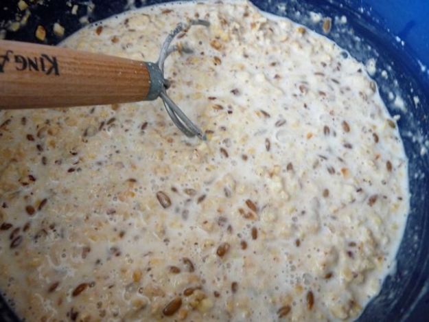 I used rye grain for the grain, it was very hard and needed a long time cooking in the pan to get it soft. I cooked mine for about an hour and a half in the end. 100 grams of dry grain will make about 200 grams of soaked and cooked grain. Then I soaked the soft and cooked grains overnight in some apple juice. Always make sure that they are really soft before you put them in the dough, they won’t get softer when you bake them.