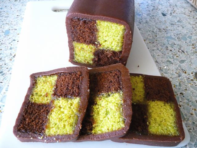 In the meantime here, with many thanks to Suelle and all the other kind people who made suggestions, is my alternative Battenburg. The chocolate part sank a little and the pistachio part is a bit crumbly and I guess the recipe needs some fine tuning way beyond my capabilities, as I am not going to make the same cake over and over.