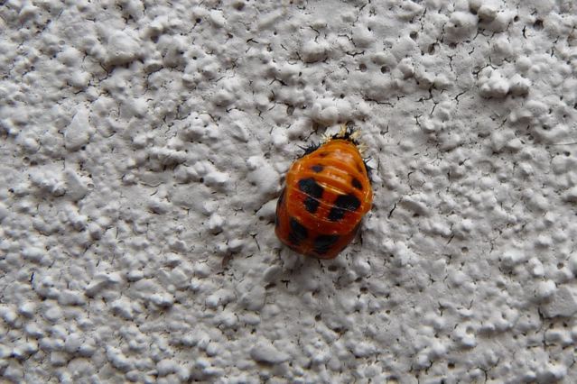 The top one is a ladybird larvae on an outside wall beginning its change…..