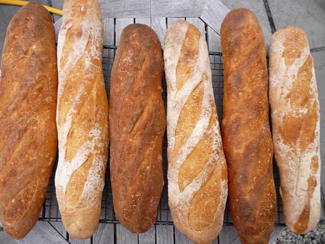 What an informative post – the different end result caused by the different flours is quite amazing. The floured surface shows up the slashing well on the ’00’ baguettes . The colour of the crust on the bags using the ordinary flour is lovely and the crumb, to my novice eye, looks better too (at least in the photo). I’m very curious to see what following Nils’ advice of wetting the slashes will bring …. but I would be worried about losing the heat, though perhaps baking on a hearth mitigates the temperature drop somewhat?