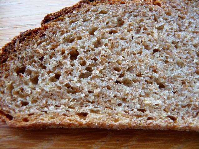 It had a nice sponginess to the texture which I put down to the soaker. I should maybe have given the bread another 10 – 15 minutes in the oven and then the base would maybe have been a little less sticky plus a little less time on the final prove but it survived my lacksadaisical handling nevertheless. Rye is very fragile once risen, as it doesn’t have the resilient gluten network of a wheat based loaf to hold the little gas bubbles. It collapses quite readily and doesn’t do oven spring, so you want to have it ‘just so’ when it goes in the oven. This one hung around a bit too long, queing up for the oven and we were eating lunch! Again these breads often do better baked in a tin or a wooden bread frame as they do in Germany.