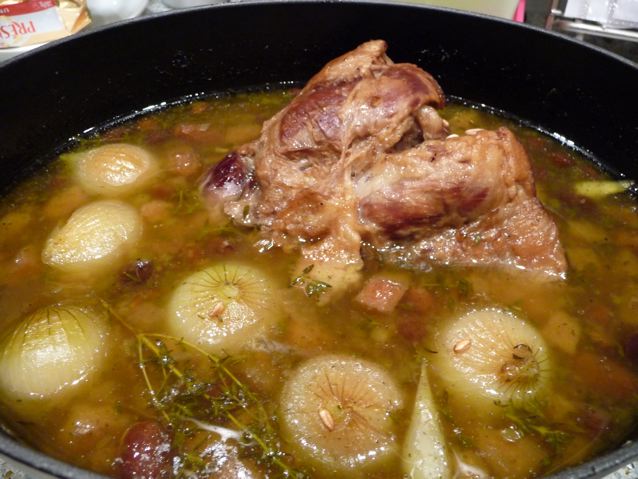 Bring to a gentle simmer on the hob. Cover and place in a warm oven for 3 hours. You will need to check the meat every hour or so and turn it over. Someone turned the oven down at some point, so we ended up cooking the dish for nearer five hours but you will know your own oven best. Once the meat has cooked and softened, add small whole onions and return to the oven for another 45 minutes or so. Then add 50 grams of spelt (farro) per person, check seasoning, cook for another 30 minutes. If you don’t have spelt, then try barley.
