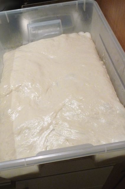 Oiled an Ikea box, poured the dough in and put in the airing cupboard. Folded after half an hour, bubble bubble, and again after a half an hour, then left it for an hour, another fold, and then after one more hour (three hours in total) the fun began.