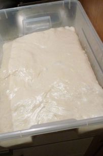 The dough was heaving and frothing like an underwater whirlpool full of giant jellyfish. After heavily dusting my board I poured the dough out, sprinkled more flour on the top and cut it with a dough cutter into pieces. I narrowly escaped the whole lot flowing onto the floor and making a run for the door at one point. Life can be too exciting in the kitchen sometimes.