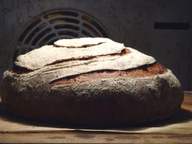 I scored a pattern into the top and baked on a kiln shelf at 235 C for twenty minutes, after which I reduced the temperature to 200 C for another 30 minutes . I used a small metal tray on the rack below the shelf as my steamer, adding boiling water to it immediately after loading the bread in the oven.