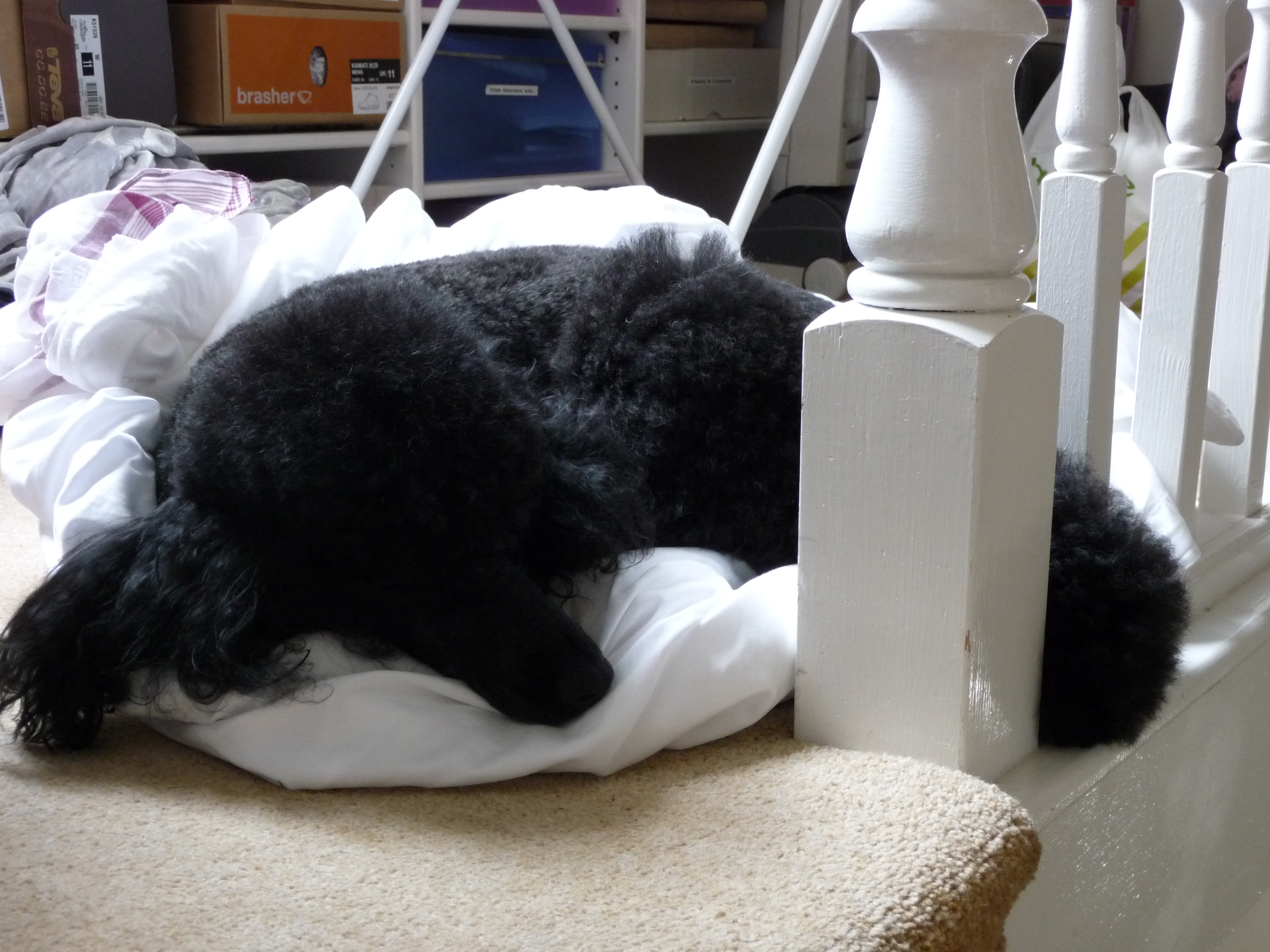 Take the sheets off the bed and leave them at the top of the stairs while you strip the rest of the beds and come back to find a poodle snuggled down in the sunshine for a quick forty winks.