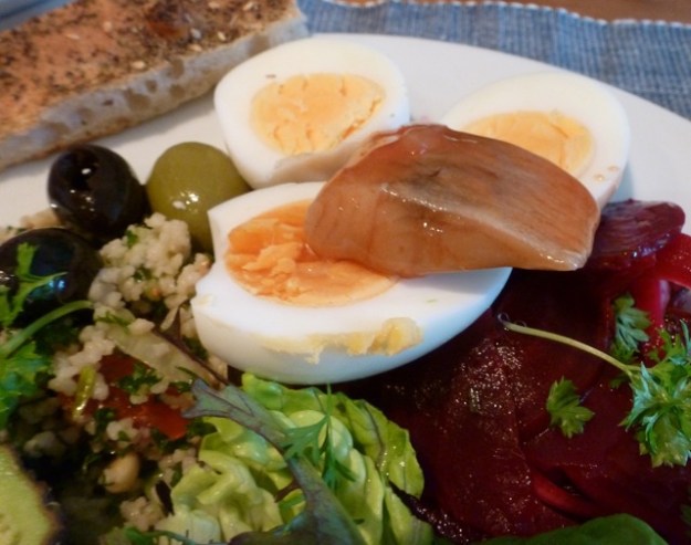 PS: As you can see from the large shadow across the photo, I can’t do food styling and much as I’d love to write more about the food we eat for dinner, the photos never work very well so you just have to imagine the sweet beetroot and crunchy onion salad, the eggs and the herring, it’s a good combination!