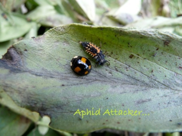 We encourage the ladybirds to stay and breed in the garden and the ladybird larvae usually eat all the aphids they can find. Sometimes though the aphids seem to get the upper hand, but eventually the ladybirds do their magic and a balance is restored.