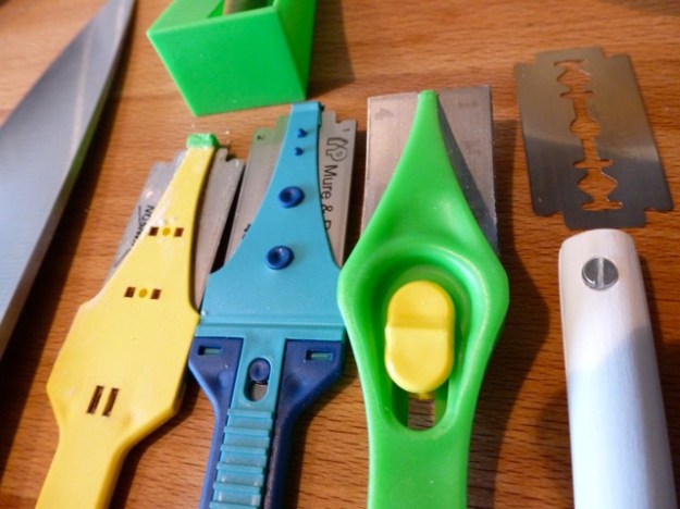 Don’t worry, they’re all tucked back in the drawer. I threaded a razor blade onto the coffee stirrer this evening just to see what it felt like, and then unthreaded it, too much tension on the blade for comfort.