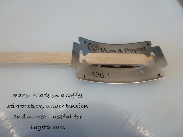 It’s French – une lame – sounds a bit odd in English, but that’s the only way I’ve heard it pronounced by the bakers I’ve asked. I have heard about this thing with the coffee stirrers, I thought, maybe wrongly, that they poked the stick through the holes in the lame and then it was supposed to curve under tension (that is if it didn’t snap) I had some in the drawer when I pulled the knives out for the photo, but I chickened out of trying it. Edit: I’ve done it and added a photo above at the end of the post for you !