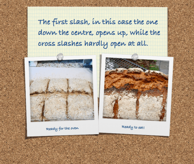 For practice purposes,slightly under-proved dough with a hydration of 55 – 60 % is best, the dough will spring more and the slashes will open up more than a fully proved loaf. The wetter doughs beloved of modern artisanal bakers can be tricky to slash beautifully. The dough often drags on the lame or the slash simply closes up as you make it. You could also experiment with shaping the dough and then chilling it for a couple of hours or more and then seeing whether it is easier to slash. Try baking from cold and see whether you like the results. I think they can be pretty good.
