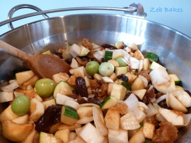 I like chutney because you don’t have to do the pasteurizing thing after you have filled the jars, though I don’t know if they advise you to do that in the States for all preserves. Here we don’t as a rule for this sort of chutney.