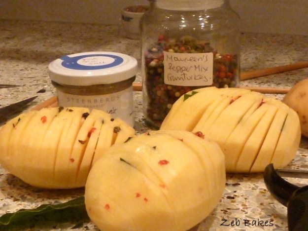 However I was reading the lovely Everybodylikessandwiches blog recently and – guess what (Tigger bounces back) – she gives a genius solution to the Hasselback cutting problem – I love her so very much for that. I don’t think she knows how much I love her. So here they are as done by me tonight. What’s the secret?