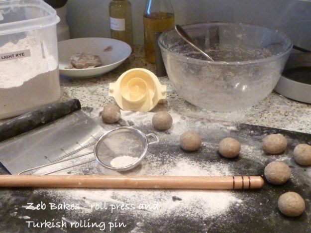I also had a narrow smooth rolling Turkish rolling pin. Much easier to see and feel what you are doing with one of these than my big fat rolling pin which always seems to stick to everything. I pinched off quite small balls of dough, half the size of a golf ball approx, and kept dusting board and hands as I went. Then I pressed the balls out, rolled them into round-square shapes, turning the shapes by a quarter after each roll to make sure they didn’t stick. After a while I got into a rhythm and I enjoyed doing these.