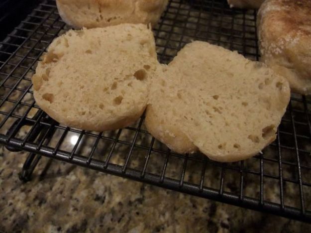 Here is the crumb after they have been for the second part of the bake in the oven – they come into their own when they are split and toasted.