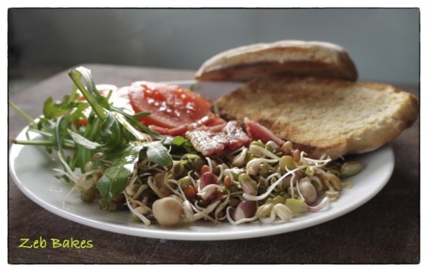 We had slices of this soft and nutty bread with cottage cheese, some mung bean sprouts and a sprinkling of za’atar, a mix of thyme, sumac, salt and sesame seeds. Can’t get much nicer than that in my book and in fact it’s all gone now, every last little bit!