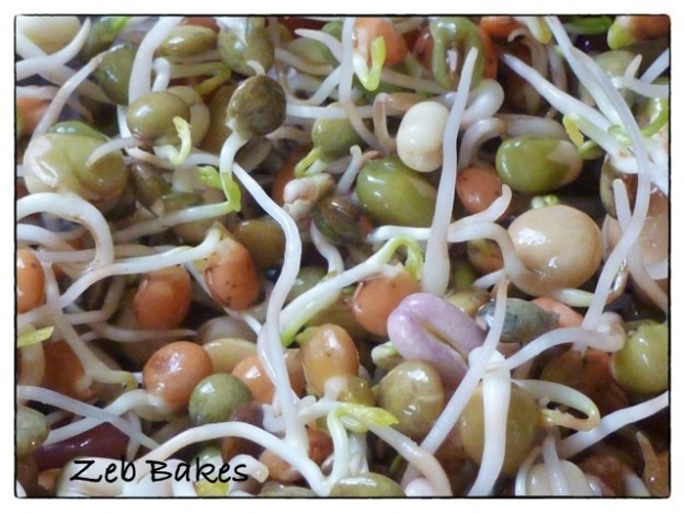 I started with what I had in the kitchen; sprouted pulses and some walnuts left over from Christmas. I have dug out my sprouting jar recently, thanks to the reminder from the 52 week salad challenge so I thought I would post this as my February contribution, as the frost has got hold of the last of the wintering vegetables and herbs in the garden this month. Edit: I have just found the round up page on VP’s blog for the last one. Have a look and join in. Lots of wonderful info on growing micro greens that I am going to read up on right now….