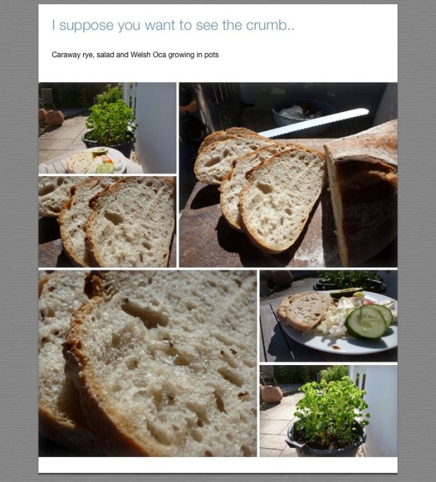 Love the collage-effect. Clever and very craft-ish. Those loaves look fab. I baked bread this weekend, and I now have a nice big, air-tight box of croutons. I tried using a silicon baking sheet for the final prove, and the dough just slid across it and the counter. Had some oven rise but not much. We headed for Waitrose and bought bread. Ho-hum.