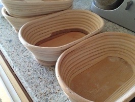 I used new Herbert Birnbaum 750g oval banettons with wooden bottoms for these loaves, like my very first ones from Germany, where I ended up sending Euros in an envelope, not a method I would recommend! These ones were purchased from The Weekend Bakery using PayPal (see Friends and Inspirations page for links) who offer excellent customer service and have a wonderful site packed with bready knowledge. You don’t need banettons to make this, you can shape freeform or use tins or improvise with a colander and an old well floured teatowel, or buy a florist’s wicker basket and line with a cloth.