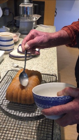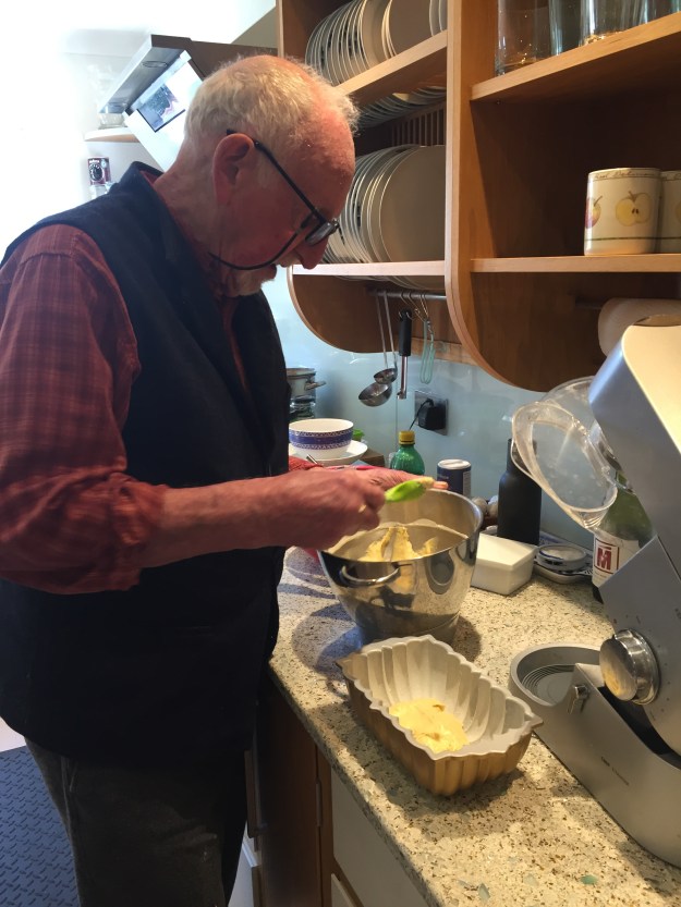 I documented the evidence of him weighing everything out, sieving flour and baking powder, using the Kenwood mixer, buttering and flouring the Bundt tin, possibly the trickiest bit of the operation and spooning the batter thoughtfully into the tin and levelling it up. I couldn’t really believe he hadn’t done this before…