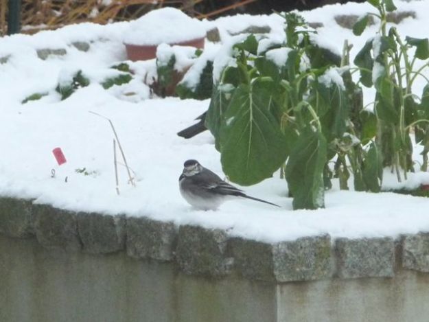 This little being is a white wagtail – we usually get pied wagtails in our towns, but not these. We get a grey wagtail sometimes, they of course are yellow bellied. This morning saw one of the jays from the woods come into the garden as well as the usual gang of finches, tits and starlings. The wood pigeons are getting fat, they will become sparrowhawk food if they carry on eating all the food we put out.