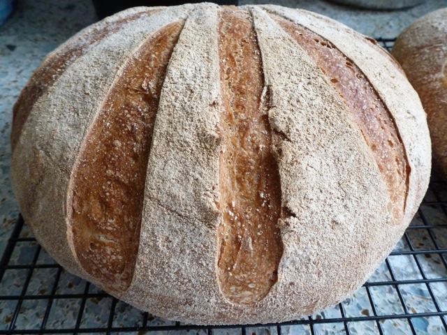 I made one loaf with the following, needing more water than the original recipe gives as my flours are very thirsty. Possibly I should have upped the water even more, as the nuts and figs absorb moisture from the dough.