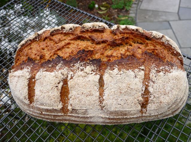 This bread is made following a recipe of Jeffrey Hamelman in the updated edition of Bread. It is made with fermented whole rye flour, strong white (bread flour) linseeds and an old bread soaker. For those of you unfamiliar with the concept of an old bread soaker, who are wrinkling your nose and going ewww, an old bread soaker is not made with a green and furry piece of ancient crust, not with a three day old slice of supermarket pap but with a drying piece of a good bread. In this case I used a slice of the sourdough I was currently eating which was about two days old. As I routinely eat my sourdoughs for up to a week after they have been baked, there was nothing scary about this at all.
